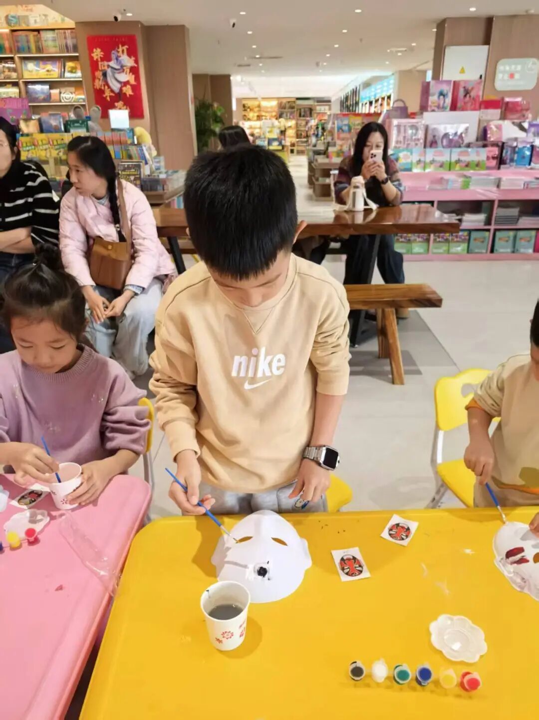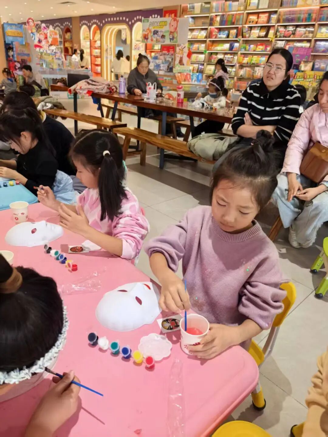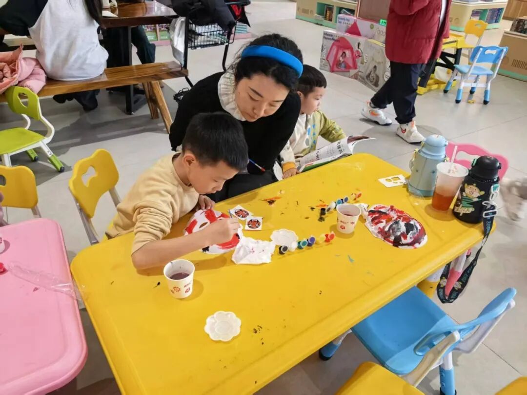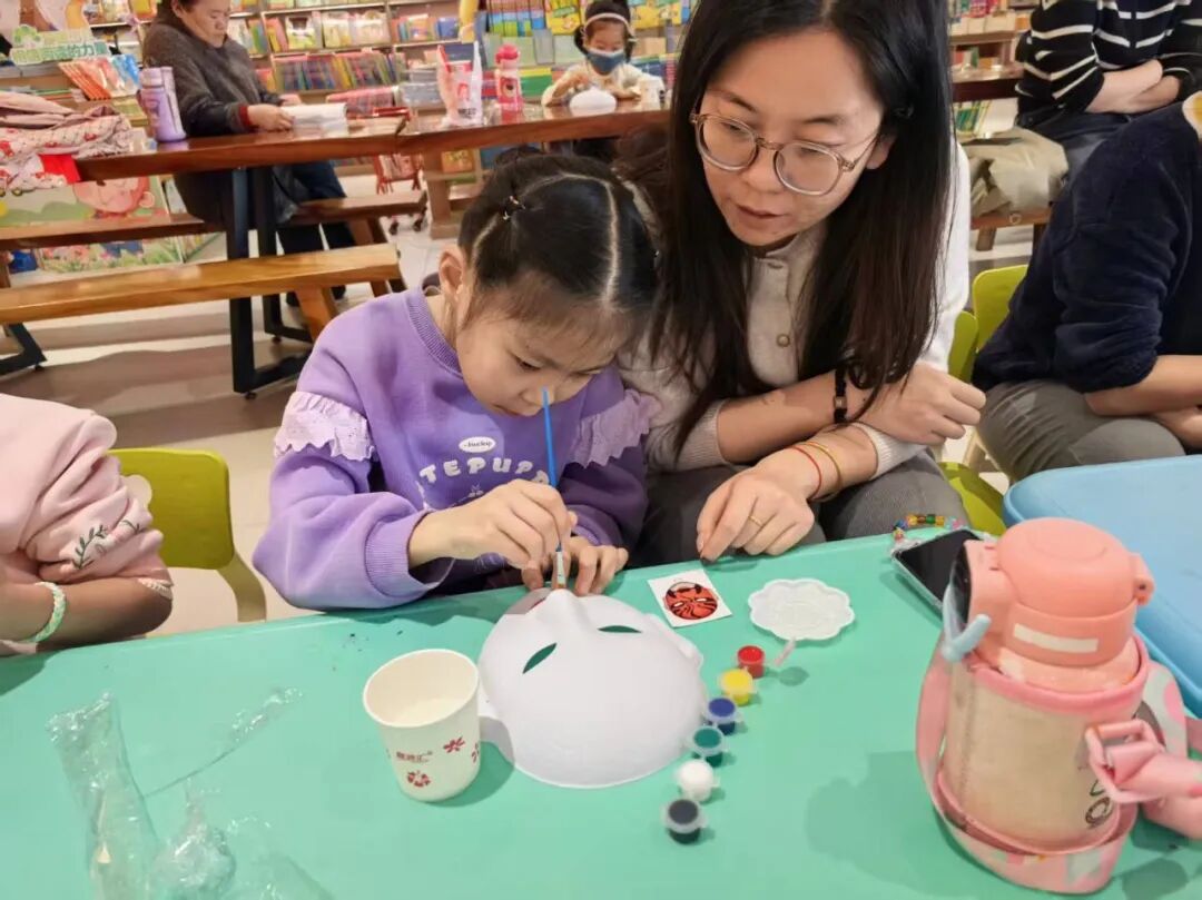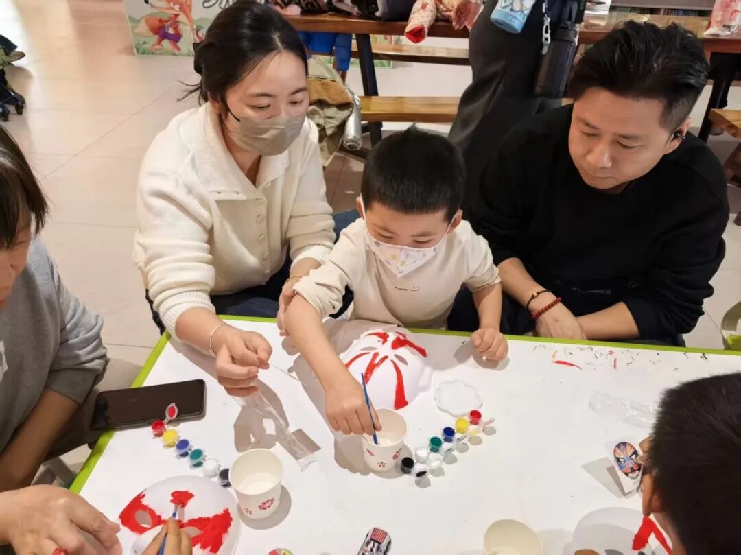 领取石膏脸谱、颜料、画笔等工具后,亲子家庭迅速投入创作。孩子们充分发挥想象力,在家长的协助下,或勾勒线条,或调配色彩,或细致涂抹。原本洁白的石膏脸谱,在大家的巧手下逐渐变得色彩斑斓、个性十足:有的还原经典京剧角色脸谱的庄重典雅,有的融入卡通元素打造童趣造型,还有的大胆创新,设计出独一无二的创意脸谱。创作过程中,家长与孩子密切配合、相互协作,时而低声讨论色彩搭配,时而共同勾勒细节轮廓,欢声笑语中洋溢着温馨的亲子氛围与对传统文化的热爱。