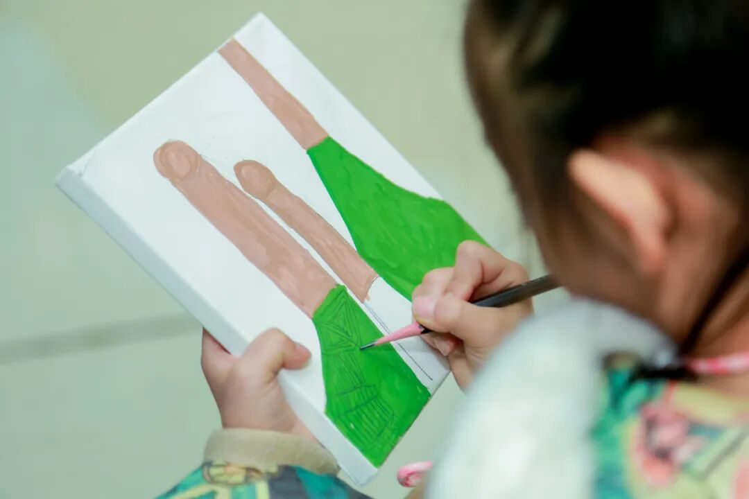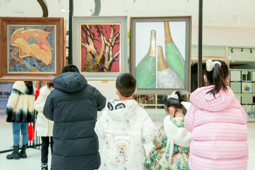 孩子们在参观完展览后,拿起画笔,在现场进行主题创作。他们或站或坐,神情专注,用稚嫩的笔触描绘出自己心中的“钢铁柔情”。孩子们的作品,与身旁的金属艺术品形成了跨越年龄的对话,让这场展览不只是观看,更是一场可触摸、可参与的美育实践。