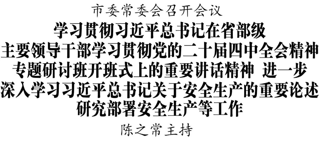 1月27日,市委常委会召开会议,学习习近平总书记在省部级主要领导干部学习贯彻党的二十届四中全会精神专题研讨班开班式上的重要讲话精神,进一步深入学习习近平总书记关于安全生产的重要论述,研究部署安全生产、贯彻中央八项规定精神、整治形式主义为基层减负等工作。市委书记陈之常主持。