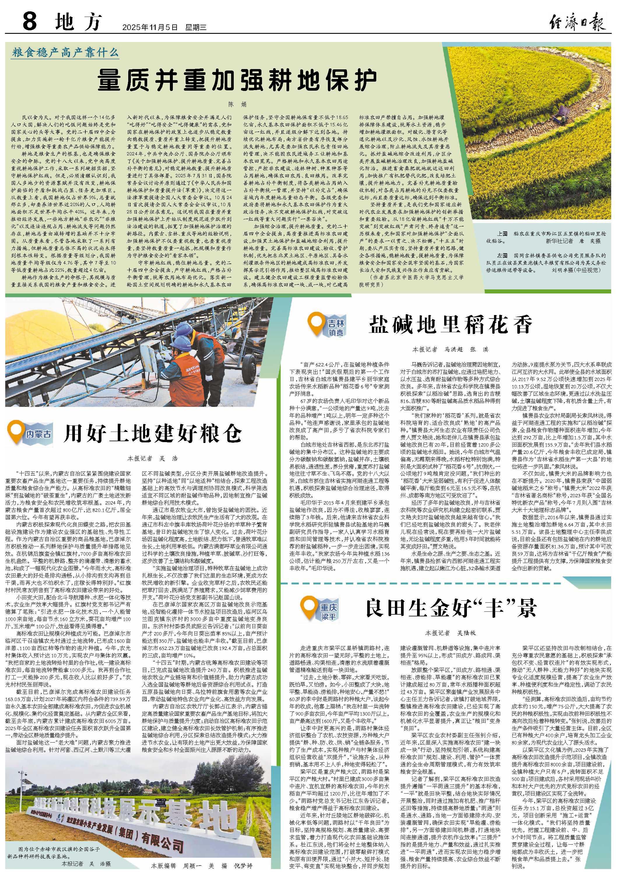 “十四五”以来,内蒙古自治区紧紧围绕建设国家重要农畜产品生产基地这一重要任务,持续提升耕地质量和粮食综合生产能力。从高标准农田的“精雕细琢”到盐碱地的“破茧重生”,内蒙古的广袤土地迸发新活力,为粮食安全和农民增收筑牢根基。2024年,内蒙古粮食产量首次超过800亿斤,达820.1亿斤,居全国第六位。今年有望再获丰收。