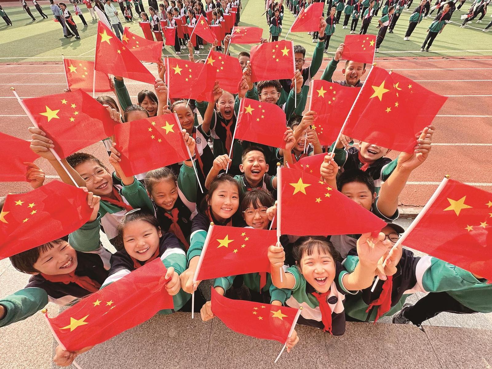 内蒙古科技大学实验小学的孩子们与国旗同框。