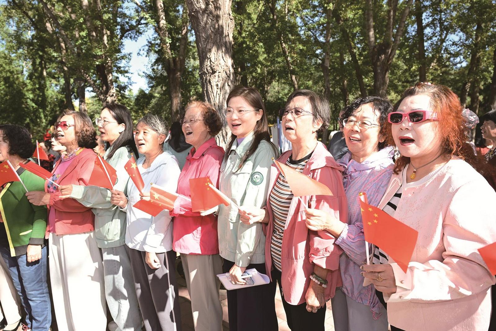 劳动公园里,老人们一起歌唱祖国。