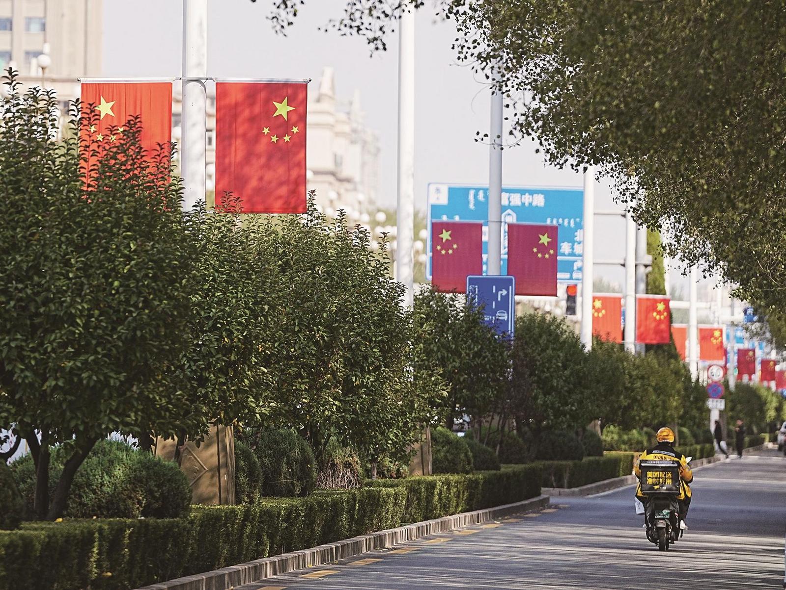 青山路上国旗舞动。