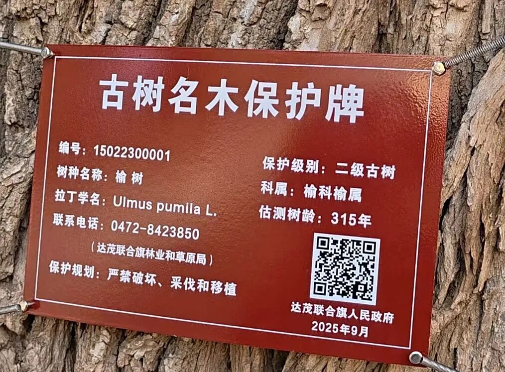 近日,达茂旗林草局为巴音敖包苏木达布希拉图嘎查和巴音宝力格嘎查大海林树的7株见证岁月的古树挂牌,其中一株古榆树树龄长达315年。