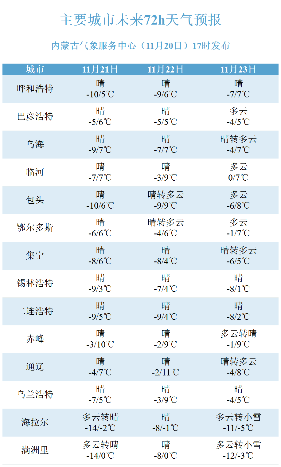 11月22日20时至24日20时,全区大部有分散性小雪或雨夹雪,其中,巴彦淖尔市北部和东南部、包头市北部、呼和浩特市东南部、乌兰察布市西北部有中雪,局部有大雪。