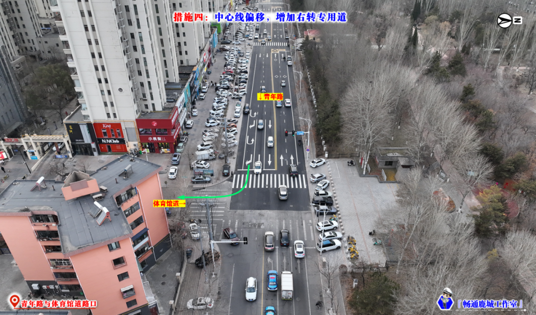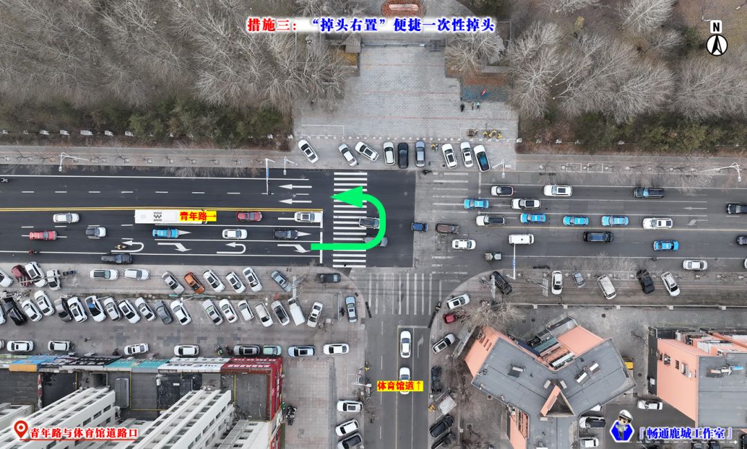 青年路原设置中央隔离护栏,由西向东方向掉头车辆需要在体育馆道掉头。受掉头半径不足限制,车辆无法一次性完成掉头,其前后挪移的过程加剧了交通拥堵。为此采取“掉头右置”优化措施, 通过调整车道布局增大掉头半径,确保车辆一次性顺利掉头,缓解路口通行冲突和交通拥堵。