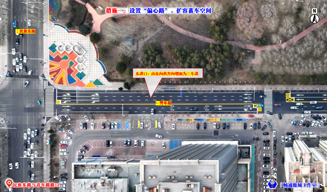 因青年路与民族东路交叉口东进口,东向南方向左转排队较长,等候左转车辆经常压占直行车辆通行,影响通行秩序。为此,对青年路(民族东路-万达路)段中心线全段向南偏移,设置“偏心路”,将由东向西方向车道增至三车道,路口通行效能显著提升。