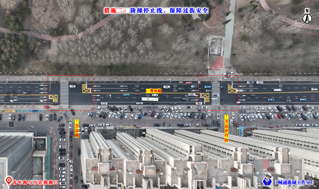 在青年路与万达路、万达步行街位置设置人行横道线,并施划阶梯停止线,能有效消除车辆行驶视线盲区,让驾驶员更清晰地观察过街行人,全面提升行人过街安全性。