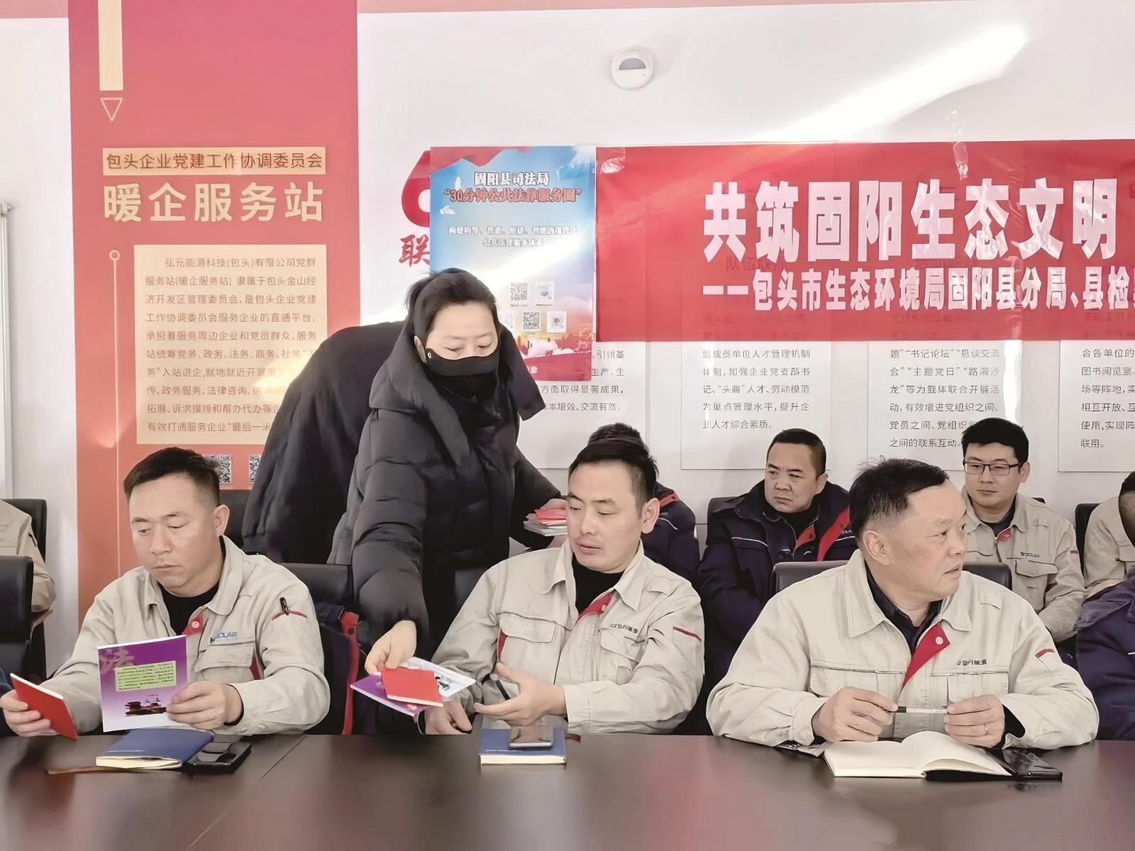 为筑牢生态文明法治根基,优化法治化营商环境,近日,固阳县司法局创新跨部门协作模式,联合包头市生态环境局固阳分局、固阳县人民检察院,走进弘元能源科技(包头)有限公司开展“绿色法治大讲堂”,以精准普法助力企业绿色合规发展。