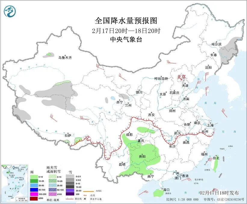 中央气象台预计,17日20时至18日20时,黑龙江东南部、吉林东部、新疆南疆南部山区以及沿天山地区西段、青海西部、西藏西部等地部分地区有小雪或雨夹雪,局地中雪;四川盆地南部、贵州、云南东部、广西西部和北部、海南岛、台湾岛东部等地部分地区有小雨。