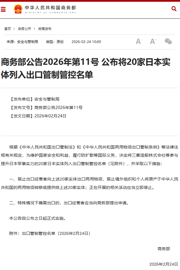 ▶商务部2月24日发布2026年第11号公告,将20家日本实体列入出口管制管控名单。详情