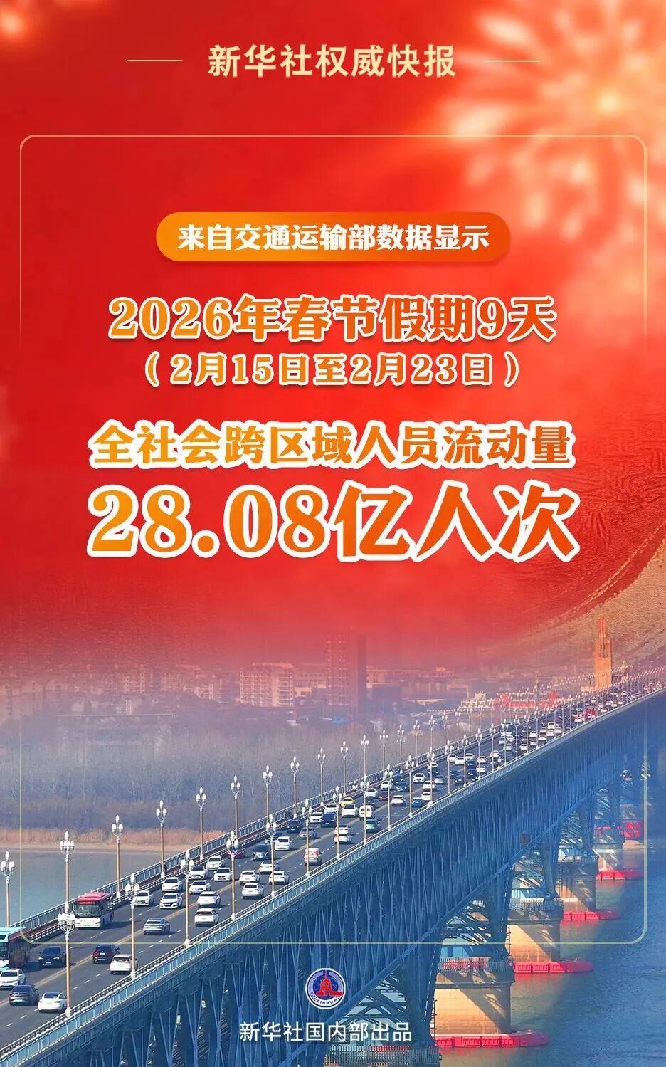 ▶2026年春节假期9天(2月15日至2月23日),全社会跨区域人员流动量为28.08亿人次,流动中国彰显澎湃活力。详情