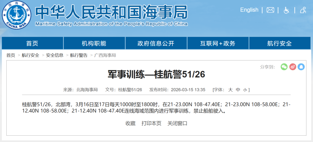 ▶据中国海事局网站消息,北海海事局发布航行警告,3月16日至17日每天10时至18时,北部湾部分海域范围内进行军事训练,禁止船舶驶入。详情