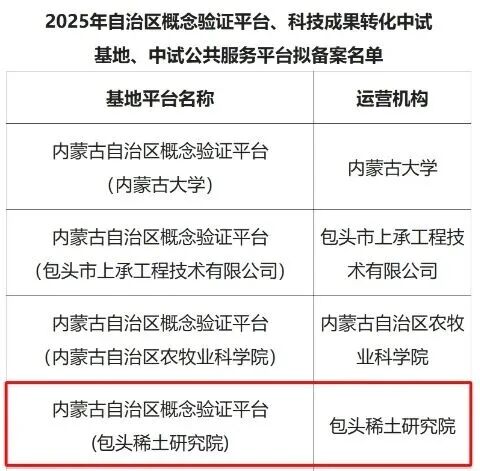 ▶近日,自治区科技厅、工信厅公布首批15家2025年自治区概念验证平台、科技成果转化中试基地、中试公共服务平台名单,包头稀土研究院获批内蒙古自治区概念验证平台。详情