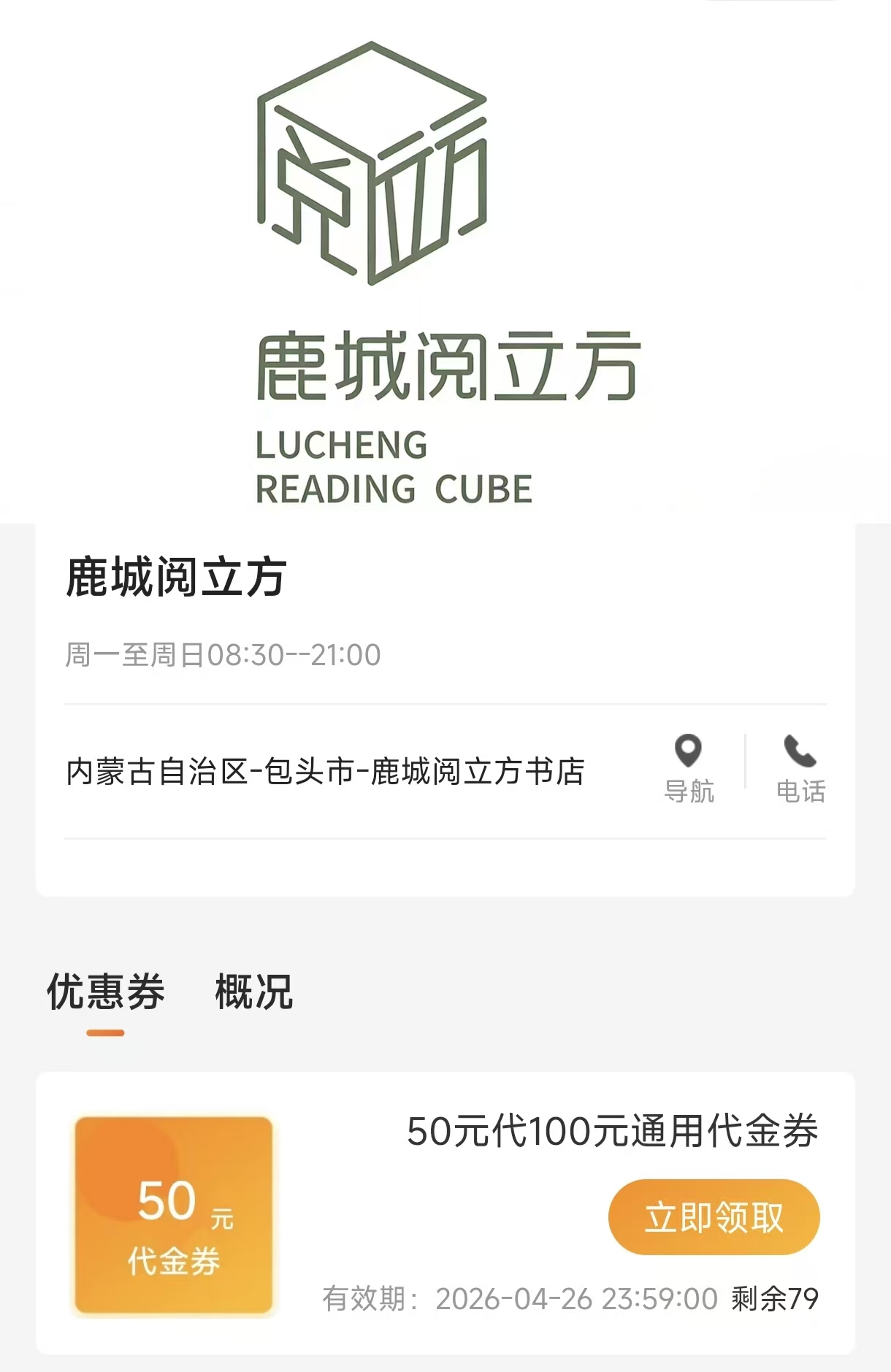 包头文化新地标、“年度最美书店”—— 鹿城阅立方,超值福利登陆“i包头”客户端“有券”平台!50元抢购100元通用代金券,图书文创全覆盖,春日书香惠全城。