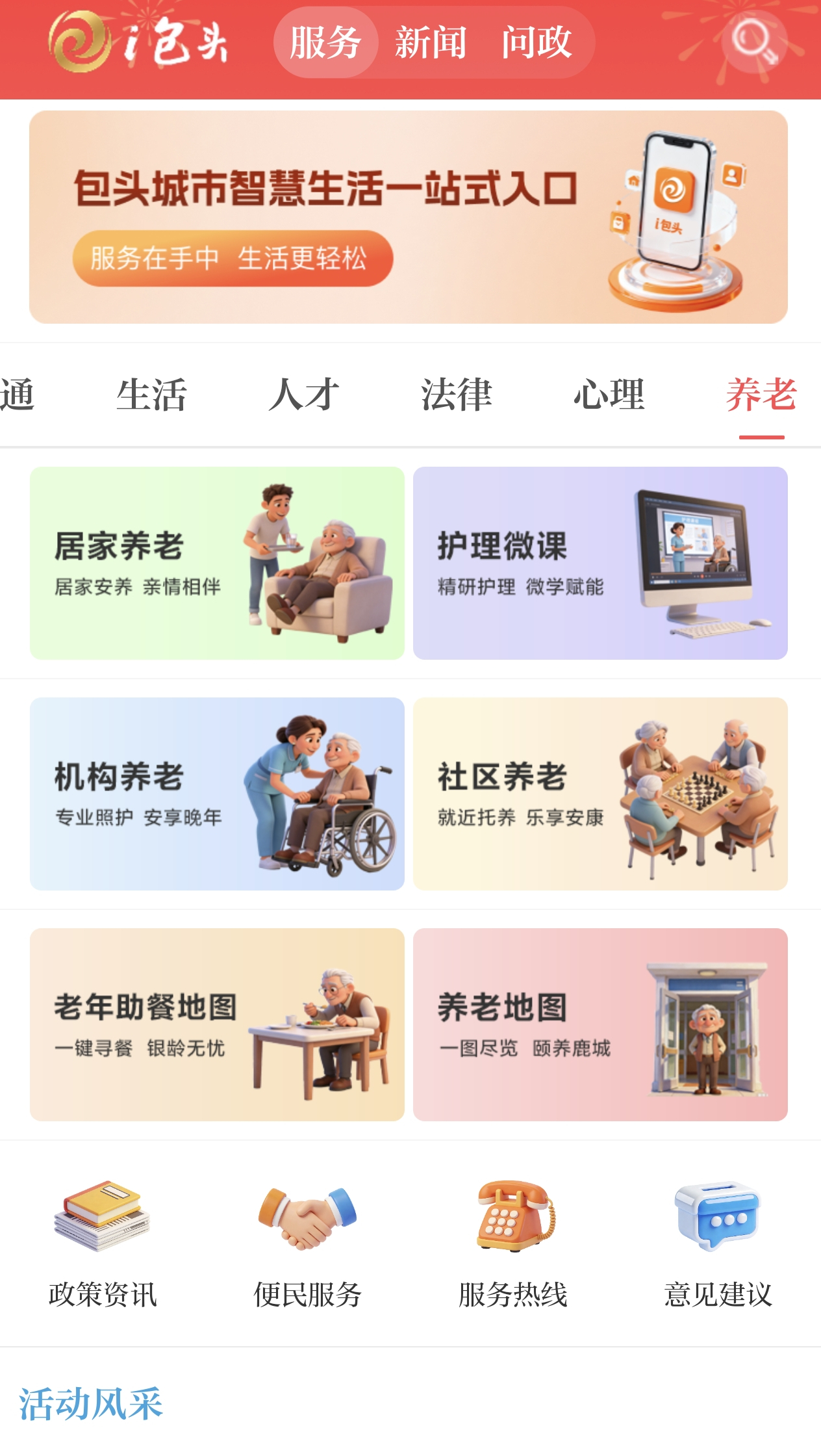 除此之外,养老板块还同步整合高龄津贴、养老保险待遇、长期护理保险等最新养老政策咨讯,汇聚助洁、助医、助浴等一站式多元化便民养老服务。市民若有相关疑问,可随时拨打服务热线0472-96111咨询,线上线下联动发力,全力解决各类养老难题。