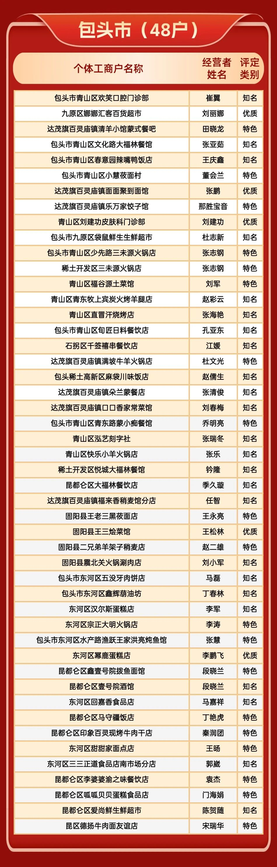▶4月17日,内蒙古自治区市场监督管理局发布了内蒙古自治区2025年度“名特优新”个体工商户名单,包头市48家个体工商户入选。详情