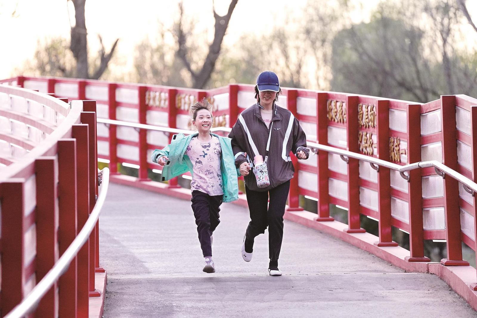 亲子跑步。