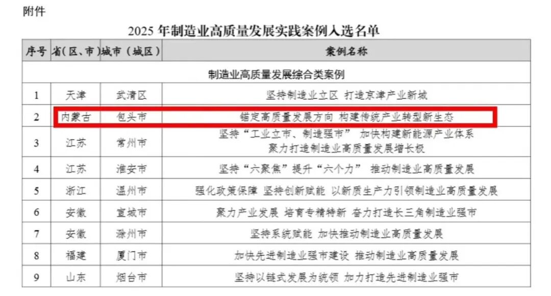 ▶近日,工信部公示了2025年制造业高质量发展实践案例名单,包头市工信局报送案例入选,是自治区唯一入选案例。详情