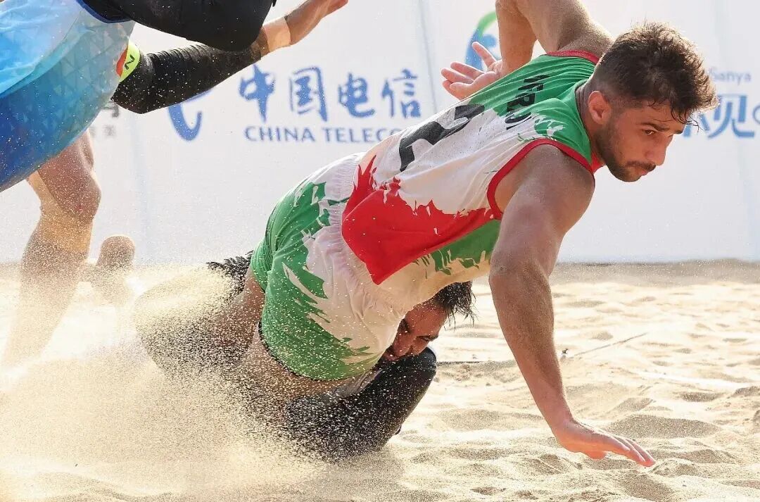 ▶4月27日,在海南三亚举行的第六届亚洲沙滩运动会沙滩卡巴迪男子决赛中,伊朗队44比31战胜印度队,获得冠军。详情