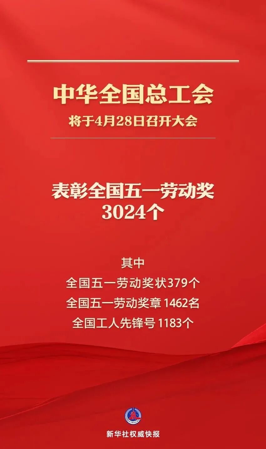 ▶全国总工会将于4月28日召开庆祝“五一”国际劳动节暨全国五一劳动奖表彰大会,届时将表彰全国五一劳动奖3024个,其中全国五一劳动奖状379个、全国五一劳动奖章1462名、全国工人先锋号1183个。详情