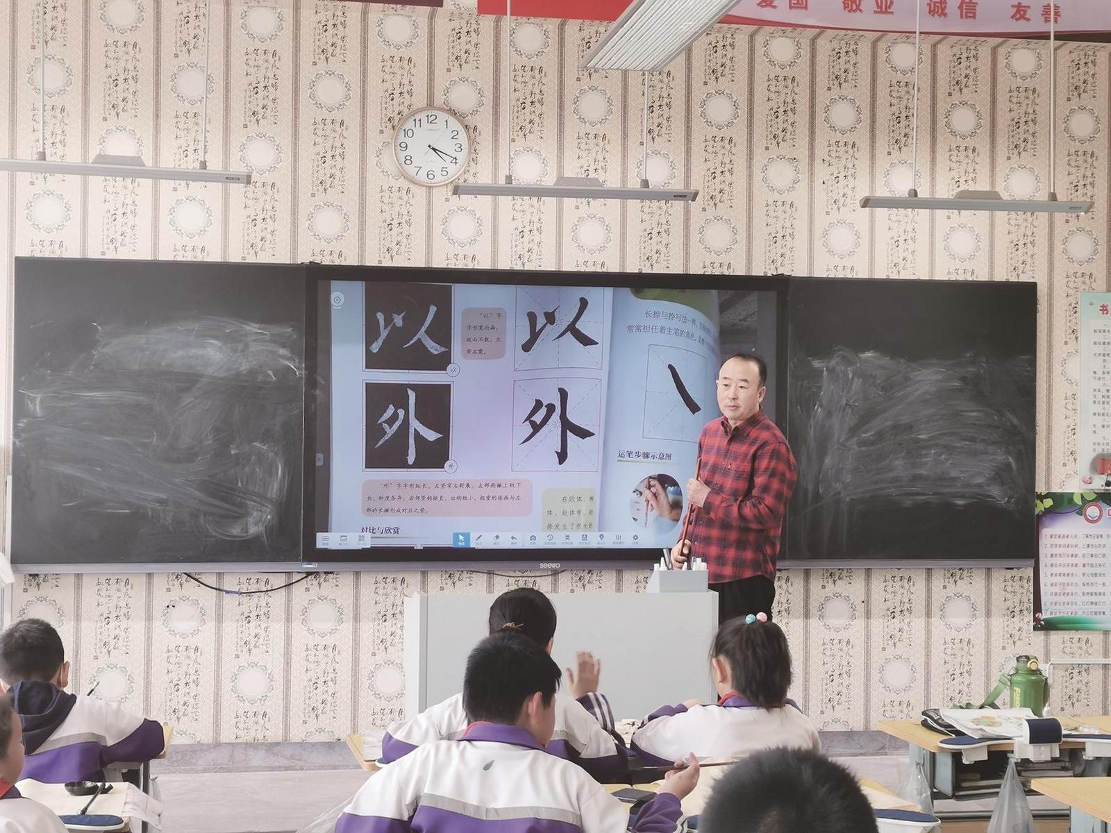 走进学校为学生们上书法课。