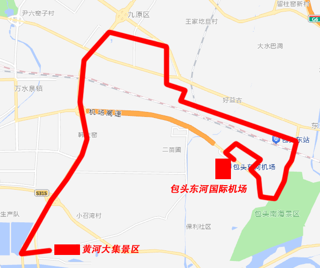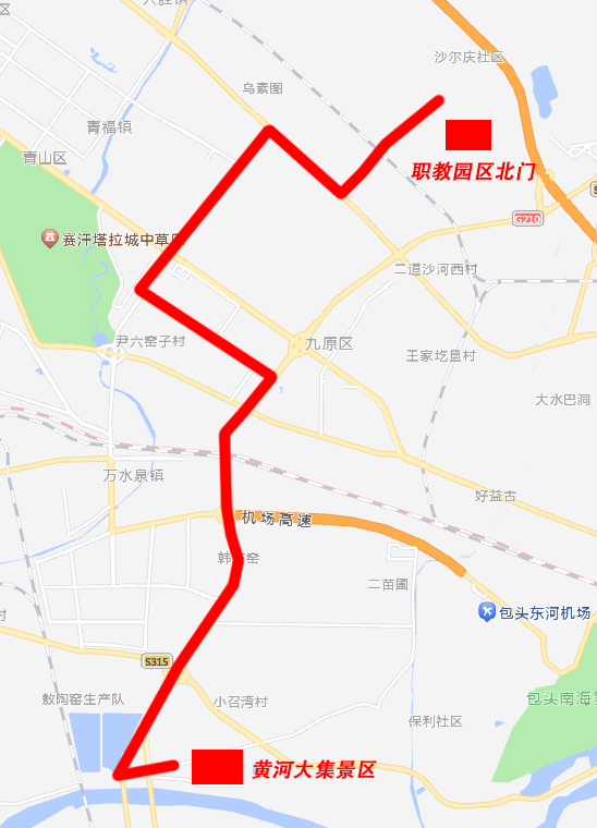 2.线路走向:包头东河国际机场—飞机场路—区间路—南海路—嘎腊木路—飞机场路—二里半路—站北路—冷库路—建国路—区间路—花园路—沙河街—210国道—雁翔路—黄河大集景区