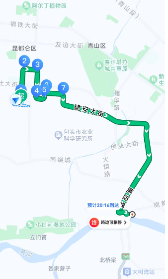 3.沿途设站:六合成公交站、六合成、文化路与阳光路口、文化路与青东路口、健康新城、文化路与民主路口、文化路与自由路口、青山商厦、包头眼科医院、王府井青山店、小尾羊大厦、富强路与文化路口、九星电子大楼、李德皮肤医院、纺织小区东门、大自然旅行社、钢铁大街与富强路口、市融媒体中心、劳动公园南门、第一工人文化宫、包头师院南门、供电宾馆、赛汗塔拉城中草原、市公安局、奥体中心、会展中心、城市公交驿站、建设路与梅力更路口、市民公园、青年生态园、建设路与210国道立交桥、黄河大集景区