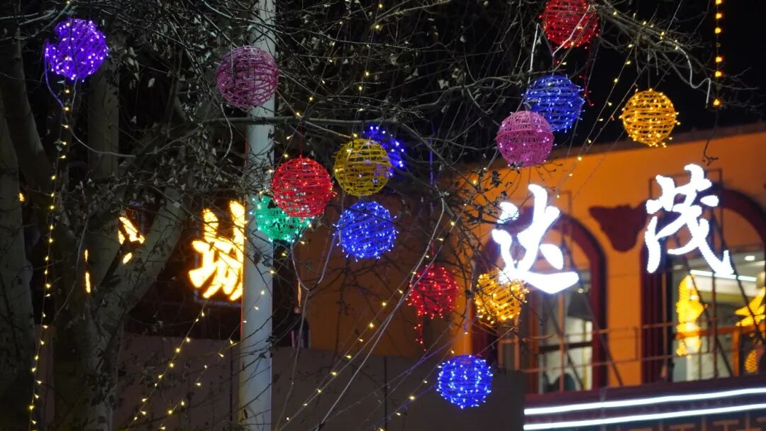 漫步在主干道,大红灯笼串成温暖的光河,在晚风中轻轻摇曳。行道树上,暖黄、冰蓝、绯红的灯串交相辉映,为寒夜披上一层温柔柔光。“达茂欢迎您”“2026 前方到站:家!”“欢迎达茂旗儿女回家过年”——暖心标语点亮街角,一字一句,轻轻叩击着归乡人的心。脚下的路,每一步都漫着回家的暖意。