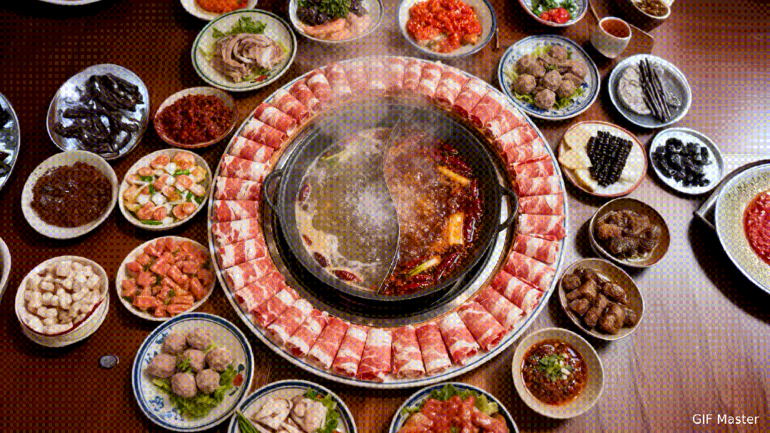 清水锅底衬着羊肉卷,家人朋友围锅而坐