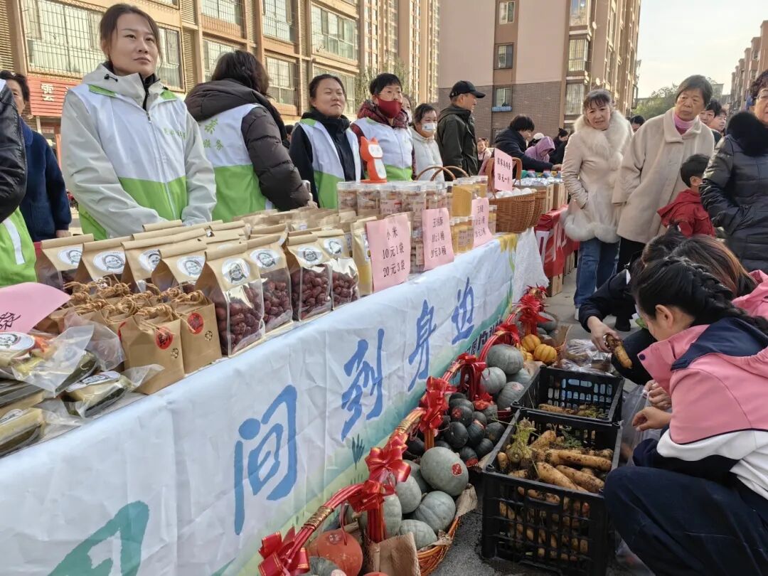 广场一侧的便民惠民市场,刚一开场就挤满了人。卜尔汗图镇带来的特色农副产品一摆上摊,新鲜的萝卜、饱满的南瓜、包装精致的杂粮,满是“乡土味”的食材瞬间吸引居民围拢;呱呱叫食品有限公司的摊位前,居民们你一言我一语,热闹地询问产品详情,挑选心仪的食品。