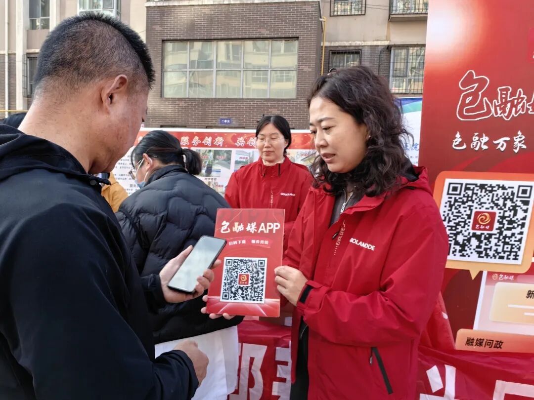 另一边的包融帮帮团服务区,人气同样“爆棚”。包头市融媒体中心的记者化身“指导员”,手把手教居民操作包融媒客户端,还耐心倾听居民诉求,递上便民联系卡片。
