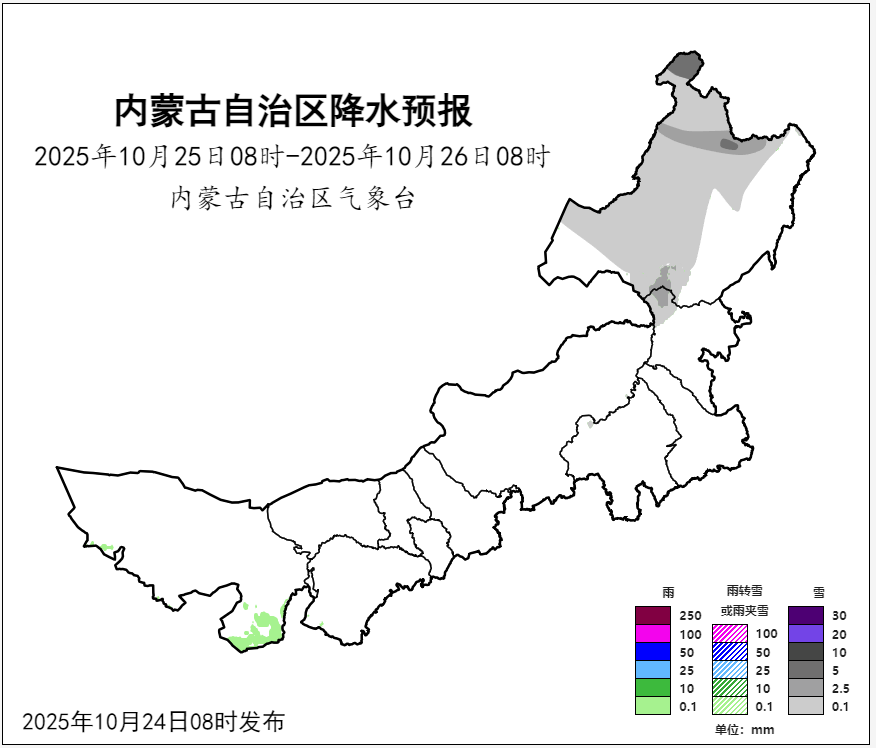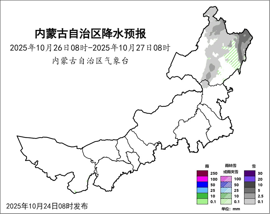 25日08时至26日08时,西部偏西南、东部偏西和偏北地区多云,有小雨、雨夹雪或小雪,呼伦贝尔市北部偏北地区有中雪,局地有大雪;中东部大部有4、5级短时6级西北风;西部偏南和偏东、中部大部地区气温下降4到6℃。