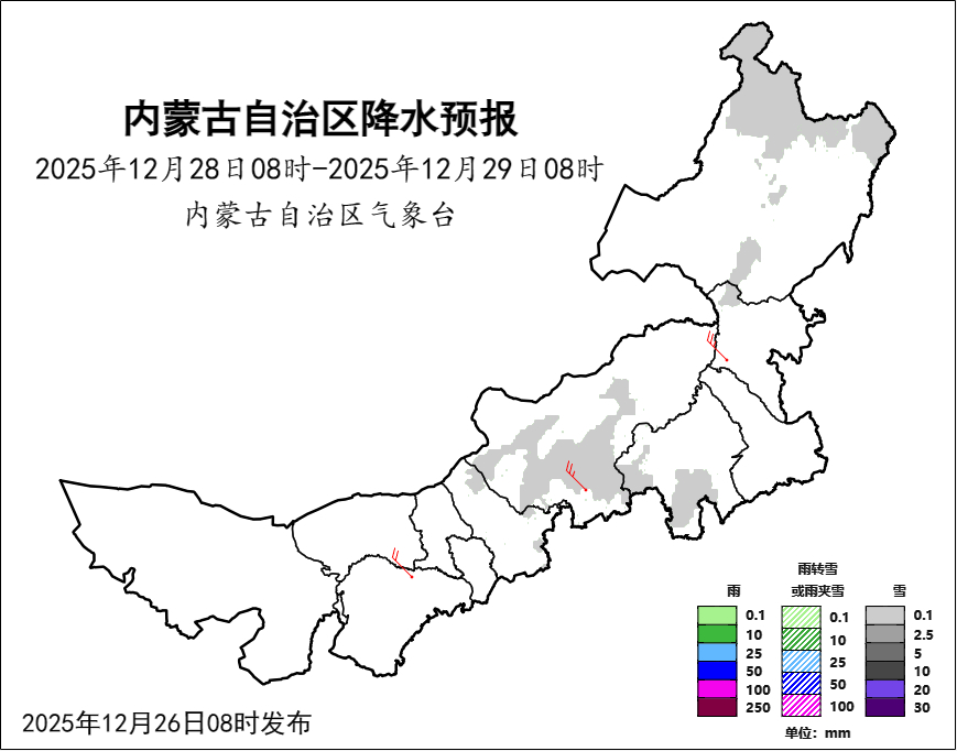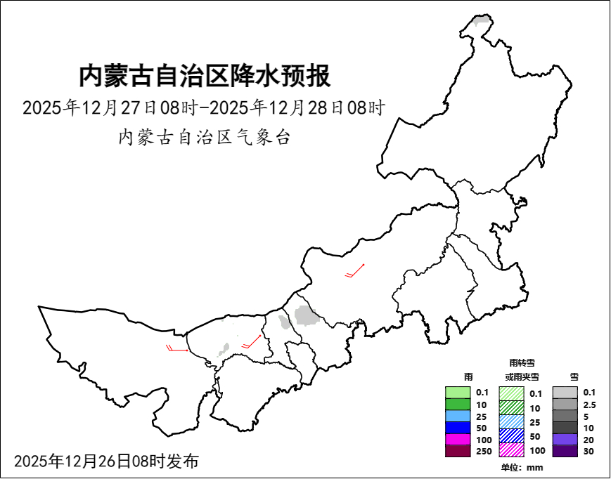 27日08时至28日08时,巴彦淖尔市西南部、包头市北部、乌兰察布市北部、呼伦贝尔市北部部分地区多云,有分散性小雪;中西部大部、东部偏西地区4、5级短时6、7级局地8级偏西风或西南风。
