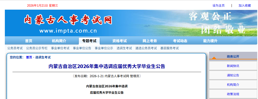 为充分发挥选调生工作在吸引储备优秀人才、改善干部队伍来源结构、充实加强基层力量等方面的积极作用,大力培养造就高素质专业化干部队伍,根据中央组织部《关于进一步加强和改进选调生工作的意见》有关规定,结合内蒙古自治区实际情况,现就集中选调应届优秀大学毕业生有关事宜公告如下。计划选调国内普通高校全日制大学本科及以上学历应届优秀毕业生466名,岗位全部为苏木乡镇(街道)岗。报名时区分限制专业岗和不限专业岗2种,限制专业岗选调能源动力类、计算机类、土木类、水利类、地质类、矿产类、农业工程类、林业工程类、环境科学与工程类、建筑类、植物生产类、自然保护与环境生态类、动物生产类、动物医学类、林学类、草学类、经济学类、法学类、农业经济管理类等相关专业学科毕业生(见附件),报考人员本科或研究生任一阶段所学专业符合要求即可报考。在高等教育所有阶段,凡定向培养(不含少数民族高层次骨干人才培养计划毕业生)、委托培养、自考本科、职业本科、成人教育、在职教育、继续教育、远程教育、网络教育、独立学院、民办院校等毕业生均不列入选调范围。(一)报考人员除应符合《中华人民共和国公务员法》、《公务员录用规定》明确的资格条件外,还应当具备以下条件:1.坚持正确的政治立场和政治态度,认真学习贯彻习近平新时代中国特色社会主义思想,深刻领悟“两个确立”的决定性意义,增强“四个意识”、坚定“四个自信”、做到“两个维护”。2.爱党爱国,自觉践行社会主义核心价值观,铸牢中华民族共同体意识,有理想抱负和家国情怀,甘于为国家和人民服务奉献,服从组织分配,并能投身基层、适应艰苦环境锻炼成长,发展潜力较大。 3.品学兼优,作风朴实,诚实守信,吃苦耐劳,遵纪守法,有较好的沟通协调能力和语言文字表达能力。此处的“品学兼优”是指:毕业生在校期间表现出较好政治素质和思想品德,并且学习成绩优良。其中,“学习成绩优良”要求毕业生在校期间,不得有必修课累计四门及以上或必修课、选修课累计六门及以上不及格、补考或重修,同一门课程多次补考或重修要累计计算(研究生考生以研究生就读期间成绩为准)。4.应届优秀大学毕业生,具有普通高校全日制大学本科及以上学历和相应学位。此处的“应届优秀大学毕业生”是指:①2026届大学毕业生(大学本科学历学位证书须在2026年1月1日至2026年7月31日期间取得,硕士研究生、博士研究生学历学位证书须在2026年1月1日至2026年12月31日期间取得)。②国家统一招生的普通高校毕业生离校时和在择业期内(国家规定择业期为二年)未落实工作单位,其档案、组织关系仍保留在原毕业学校,或者保留在各级毕业生就业主管部门(毕业生就业指导服务中心)、各级人才交流服务机构和各级公共就业服务机构的2024年、2025年普通高校毕业生。毕业后申请第二学士学位的应届毕业生,以及按全日制教育方式培养,但学历证书明确为“非全日制”的应届毕业生均不列入选调范围。①中共(预备)党员(入党时间截至2026年1月21日)。③在高校就读期间(全日制大学本科及以上学历),担任校院系团委副书记、部长、副部长,党(团)支部书记、副书记,校院系学生会(研究生会)主席团成员、部长、副部长,班长、副班长,任职满半年及以上;同时,还应获得校级以上优秀学生、三好学生、优秀毕业生、优秀学生干部、优秀党(团)干部、优秀党(团)员等荣誉称号或获得国家级奖学金、省部级奖学金、校级二等以上奖学金。 6.截至2026年1月21日,年满18周岁,大学本科生为2000年1月21日之后出生,硕士研究生为1997年1月21日之后出生,博士研究生为1993年1月21日之后出生;具有完整参军入伍经历的年龄相应放宽2岁。7.身心健康,具有正常履行职责的身体条件和心理素质,符合公务员录用体检标准。1.已被国家机关、国有企事业单位录用(聘用)为正式工作人员的;2.在校期间有违法违纪违规行为、学术不端或道德品行问题的;3.受过处分的或因犯罪受过刑事处罚的,或涉嫌违纪违法正在接受有关机关调查尚未作出结论的;6.被开除公职或公务员(参公人员)被辞退或被取消录用资格未满5年的;7.在公务员招考或企事业单位招聘中被认定有舞弊等严重违反录用(聘用)纪律行为的;10.在本次考录报名结束至办理录用手续前,成为在读全日制学生的;11.有法律法规规定不得录用为公务员的其他情形的。符合条件的意向报名人员须以全日制最高学历报考,请于2026年1月26日上午10:00—2月4日17:00登录内蒙古人事考试网(www.impta.com.cn)注册填写报名信息、报考类型,同时结合本人政治面貌、学位层次、参军入伍经历、在校职务、获荣誉及奖学金等情况,认真、谨慎勾选综合素质评价项目中的相关要素(具体要素见报名网站)。报名申请完成后,请在线打印《内蒙古自治区2026年集中选调应届优秀大学毕业生考试报名申请表》(一式两份,本人和学校各留存一份,以下简称《报名表》),本人签字确认后向所在高校院系党组织和就业主管部门提交审核并签字盖章。特别提醒:姓名、身份证号和综合素质评价项目等信息提交后无法修改,考生须对网上所填报信息的真实性、准确性、完整性负责,填报虚假信息、隐瞒重要信息、误填信息而影响审核、考试、录用等的,后果由本人承担。凡故意隐瞒、虚报