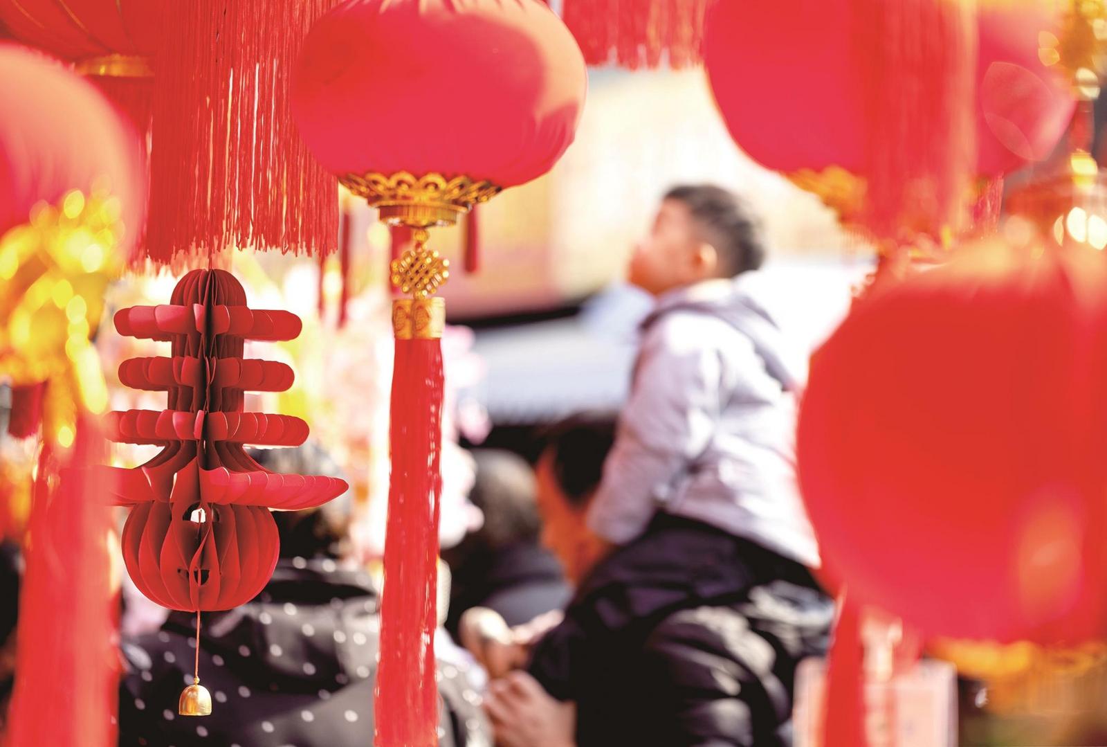 市民在江苏省南京市一卖场选购新年饰品。 新华社发(孙忠南 摄)