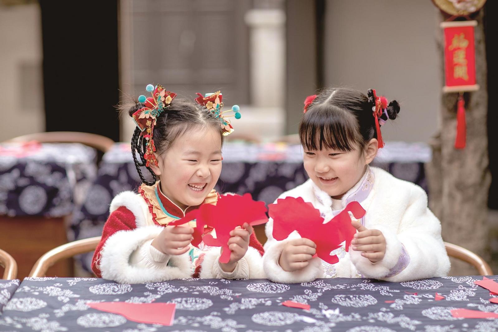 2月2日,在江苏省兴化市昭阳街道的毕飞宇工作室内,孩子们在老师的指导下创作以生肖马为主题的剪纸。 新华社发(周社根 摄)