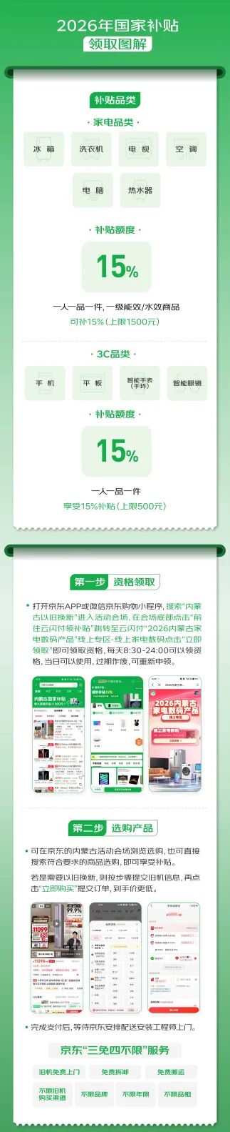 打开京东APP或微信京东购物小程序,搜索“内蒙古以旧换新”进入活动会场,在会场底部点击“前往云闪付领补贴”跳转至云闪付“2026内蒙古家电数码产品”线上专区-线上家电数码”点击立即领取”即可领取资格,每天8:30-24:00可以领资格,当日可以使用,过期作废,可重新申领。也可直接搜索符合要求的商品选购,收货地址限制在内蒙古地区,需限定云闪付支付,即可享受补贴。用户可选择单独购买产品,也可选择使用以旧换新下单,均可享国补。