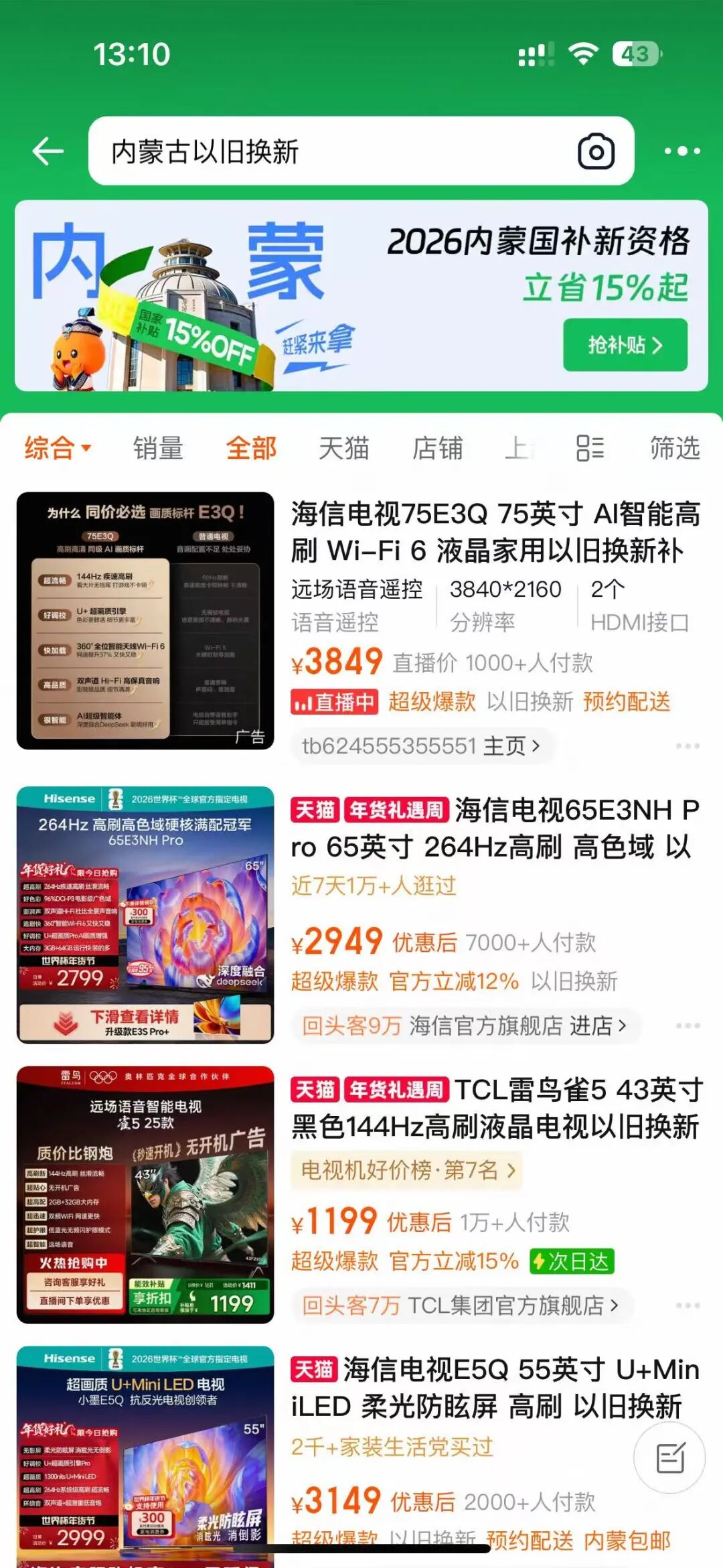 在各大电商平台APP内搜索内蒙古以旧换新,跳转至云闪付“2026内蒙古家电数码产品线上专区”-“线上家电数码立即领取”,选择所需的品类补贴券,返回线上平台选购相应品类商品,支付即可享国补优惠。