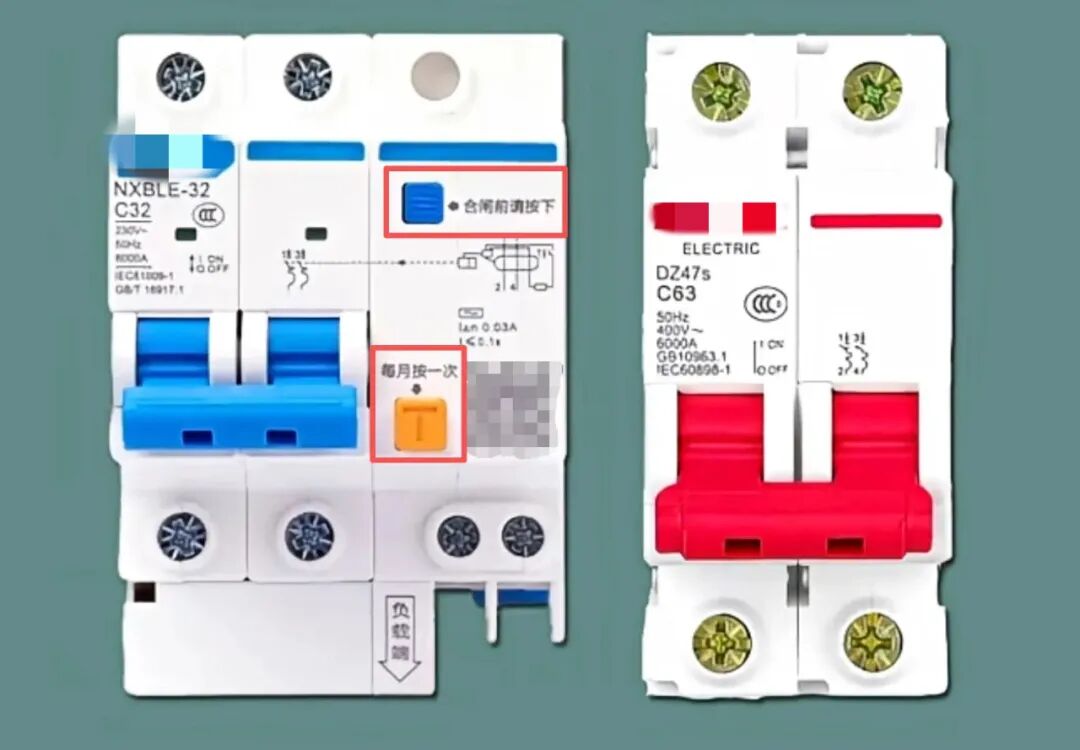 漏电保护开关多了“复位按钮”(蓝色小方块)与“测试按钮”(T键),具备漏电保护功能。当检测到人体触电、火线接地或接零时,会瞬间跳闸,对人身安全的防护性更强。