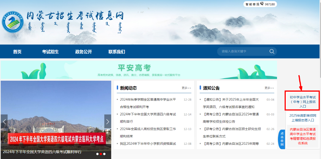 ● 考生在规定时间登录“内蒙古招生考试信息网”(https://www.nm.zsks.cn)首页,点击页面右上方“初中学业水平考试(中考)网上报名入口”链接进入报名系统。