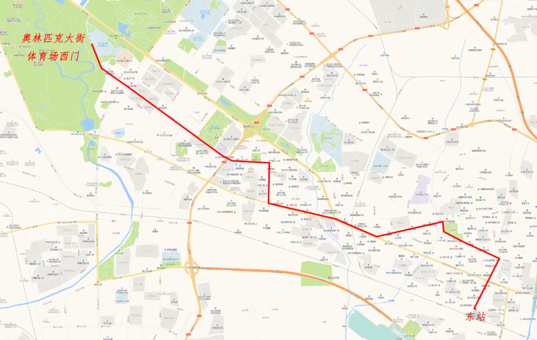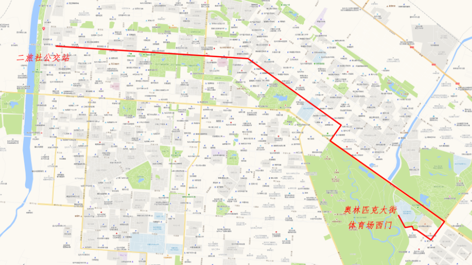 (2)线路走向:二旅社公交站—团结大街—科学路—青东路—建设路—建华南路—祥和北路—奥林匹克大街体育场西门;