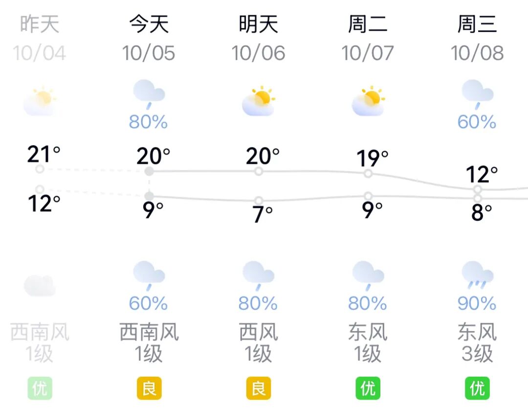 10月8日:小雨,气温5℃~10℃,东风3级。