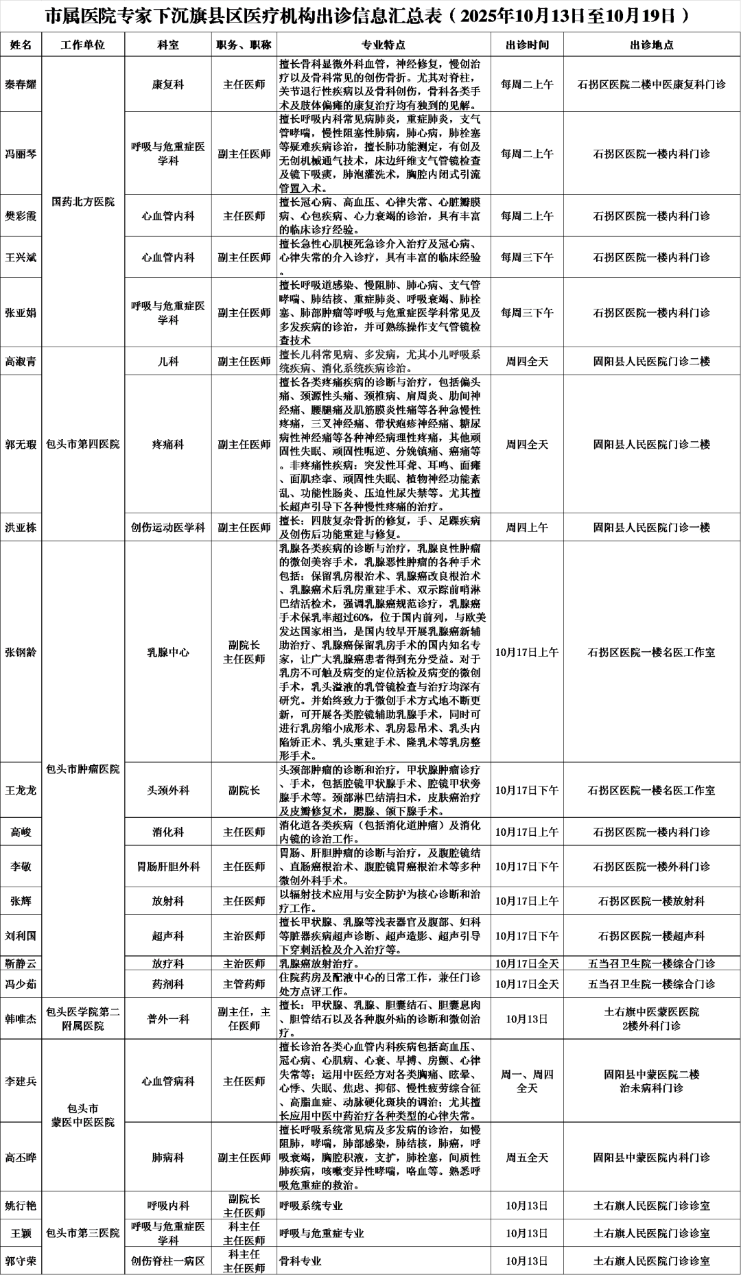 为让包头百姓在“家门口”就能享受到市属医院专家优质服务,现将下周市属医院专家下沉旗县区医疗机构出诊信息予以公布。