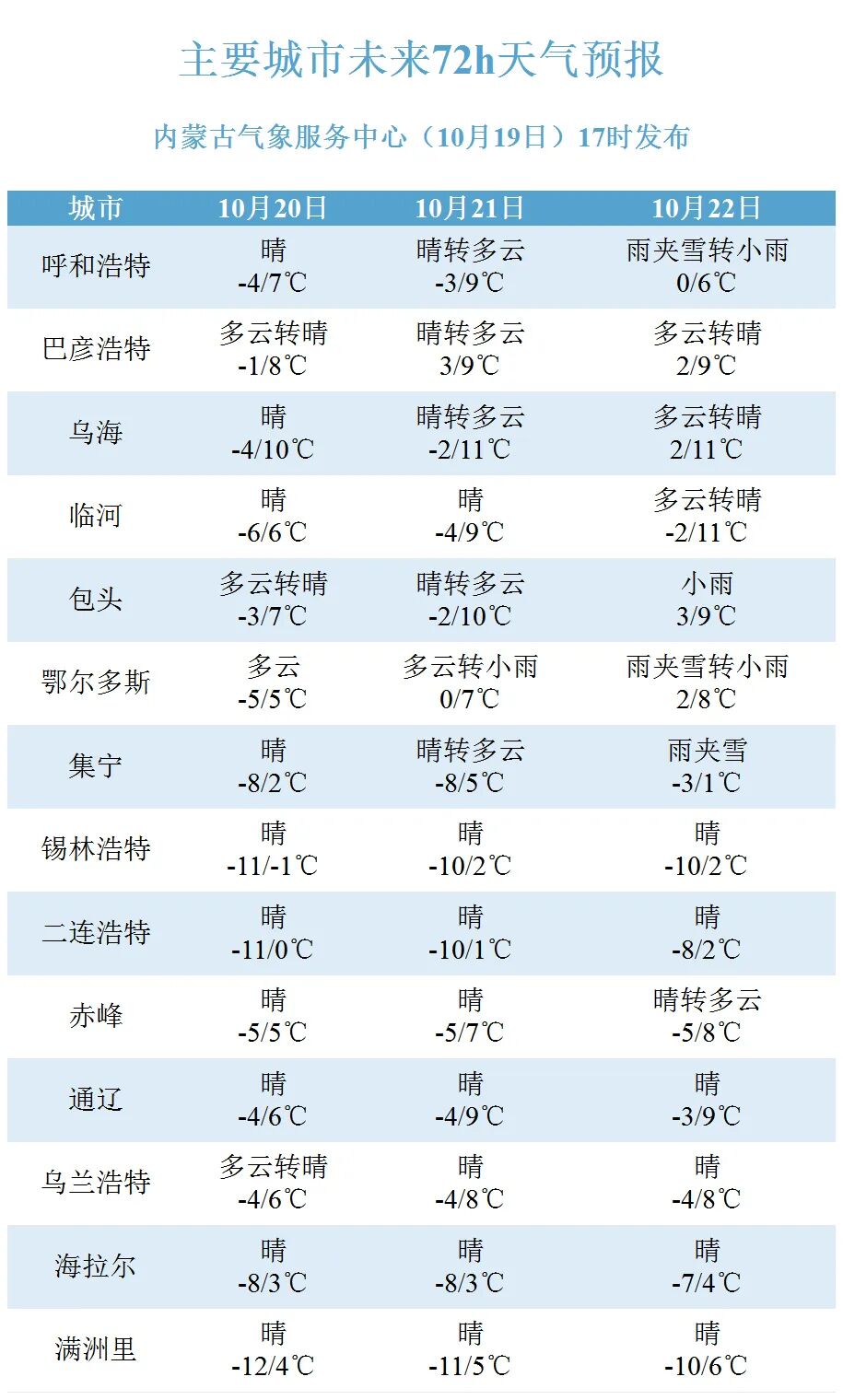 具体未来三天天气预报如下:19日08时至20日08时,内蒙古自治区中部偏东北、东部偏西和偏北地区多云,有小雪;西部偏西、中部偏东、东部偏西和偏南地区有4、5级短时6、7级偏东风或西北风;西部偏东南、中部偏西南地区气温下降4~6℃。