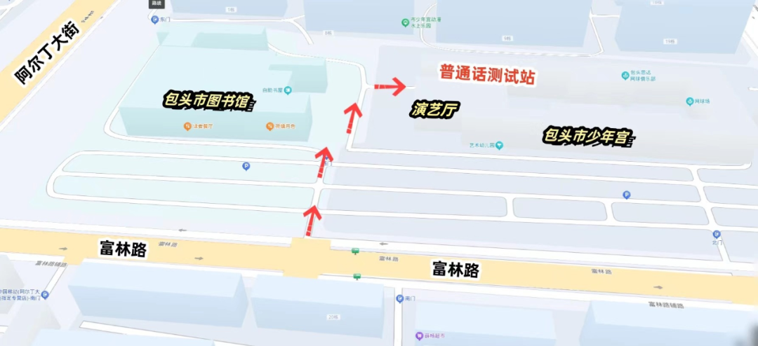 测试考生可乘坐1路、22路到包头市图书馆下车,向西步行至包头市少年宫;或乘27路到包头市少年宫北门站,直线距离约110m;乘8路、60路到包头市少年宫站,直线距离约259m。