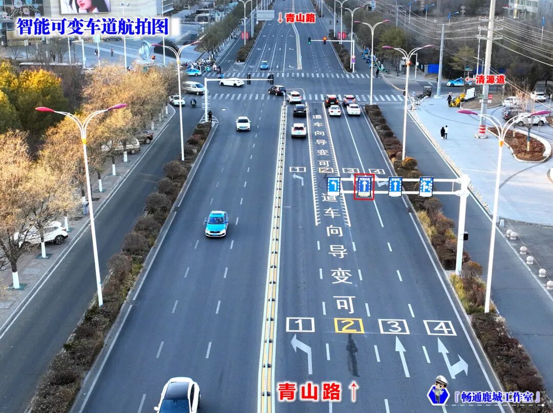 在青山路由东向西方向行驶的车辆,驶入可变车道前,应提前观察“可变车道LED指示屏”的导向箭头,按照车道导向指示选择行驶方向: