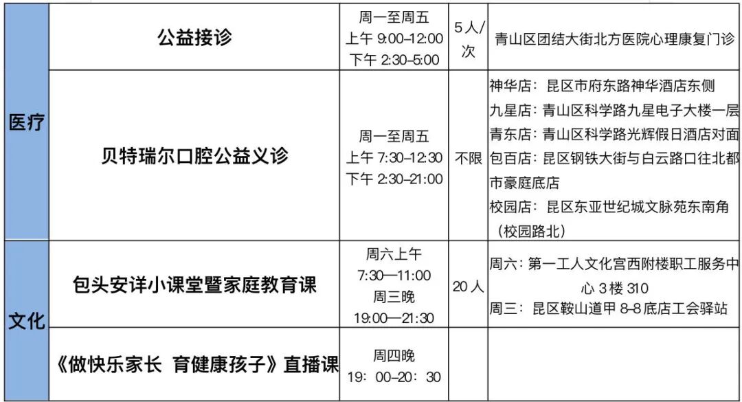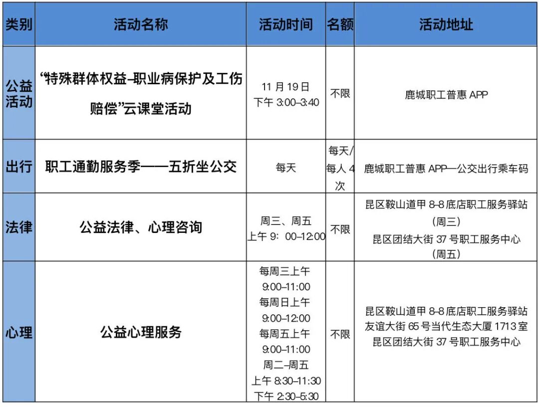 地点:第一工人文化宫西附楼职工服务中心3楼310(周六)昆区鞍山道甲8-8底店工会驿站(周三)