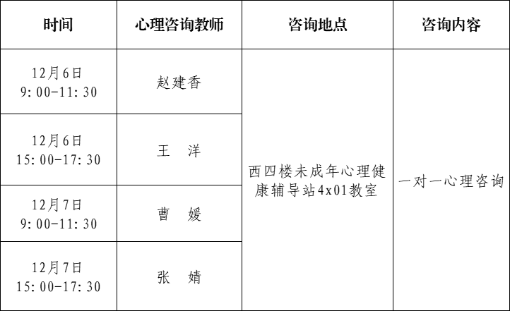 为落实立德树人根本任务,切实做好全市中小学心理健康工作,为广大青少年学生及家长朋友们提供优质的心理健康与家庭教育服务,市教育局在包头市未成年人心理辅导站设立包头市中小学“周末公益咨询室”,免费向全市中小学生、教师及家长提供心理健康服务。