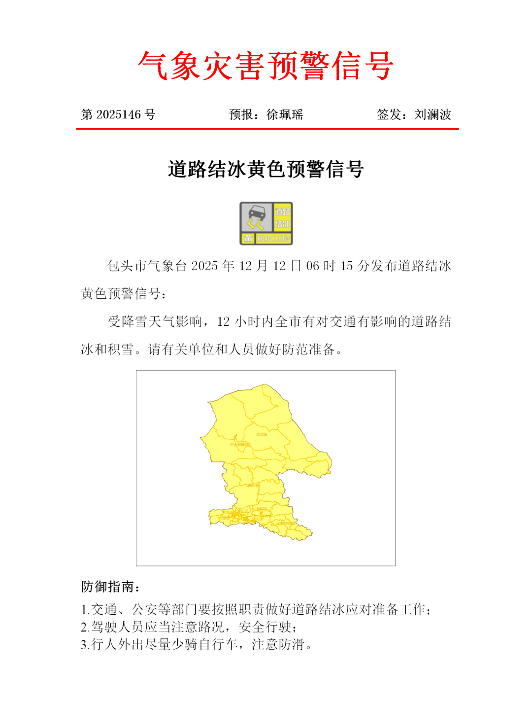 发布道路结冰黄色预警信号